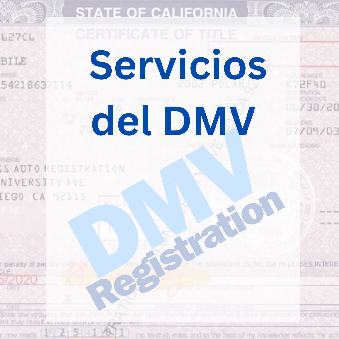 Tenga en cuenta: Tenemos una licencia ocupacional n.º 27414, otorgada por el estado de California, para realizar servicios de registro. Este negocio no está asociado ni es propiedad de ninguna agencia gubernamental y no está afiliado al DMV.